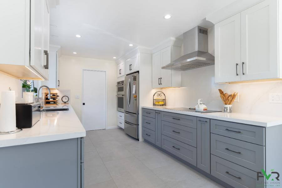 Future Vision Remodeling is proud to reveal a stunning kitchen remodel in Sunnyvale, CA. The kitchen boasts a contemporary white and grey design, featuring elegant grey cabinets paired with a pristine white marble countertop. This color palette evokes a sense of sophistication and cleanliness. Soft grey flooring complements the cabinets, while white paint brightens the space, making it feel more open and inviting. To see more of our work in kitchen design, visit our Kitchen Remodel page.