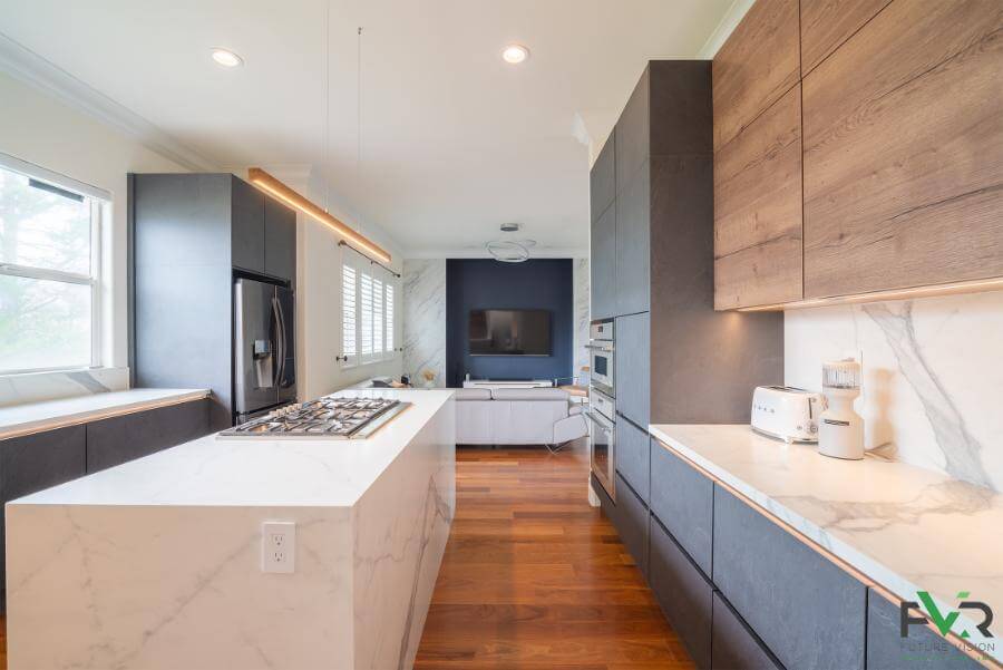 Future Vision Remodeling is excited to present a sophisticated kitchen remodel in South San Francisco, CA. This project showcases a harmonious blend of grey and white design elements, creating a modern yet timeless kitchen space. The kitchen features a stunning white marble countertop, offering both beauty and durability, contrasted with dark grey cabinets that provide a sleek and contemporary look. The wood flooring adds a warm and natural element to the kitchen, beautifully complementing the white painted walls. Some wall cabinets in wood, matching the flooring, bring a cohesive and elegant feel to the space. A unique long and thin wood lamp hanging over the central table, along with additional ceiling lights, ensures the kitchen is well-lit. Large windows allow natural light to flood the room, enhancing the open and airy atmosphere. For more on our kitchen remodeling services, visit our Kitchen Remodel page.