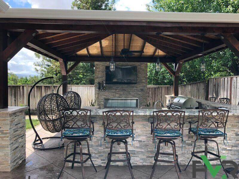 Future Vision Remodeling is thrilled to present a sophisticated outdoor renovation in Redwood City, CA. This project involved the creation of an outdoor wood structure, within which lies a beautiful outdoor kitchen. The kitchen features a high-quality barbecue and a countertop with a stunning marble design, perfect for outdoor cooking and entertaining. The area is further enhanced with a cozy fireplace and a TV, making it an ideal spot for relaxation and entertainment. The bar-style table, accompanied by tall chairs, provides a unique and comfortable dining experience, allowing guests to enjoy meals, watch TV, or simply relax in the inviting atmosphere. Comfortable chairs are also available, all set upon mosaic stone wall that impeccably matches the outdoor ambiance. For more information on outdoor remodeling, visit our Outdoor Remodel page.